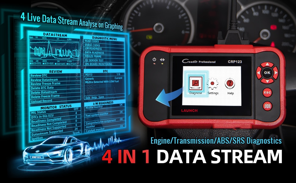Launch CReader Professional 123 main functions do not only include OBD / EOBD standard protocol diagnosis, but also cover professional diagnostic software for multiple models which can perform comprehensive diagnosis on four main ECU’s (ENG\ABS\SRS\AT) of vehicle.