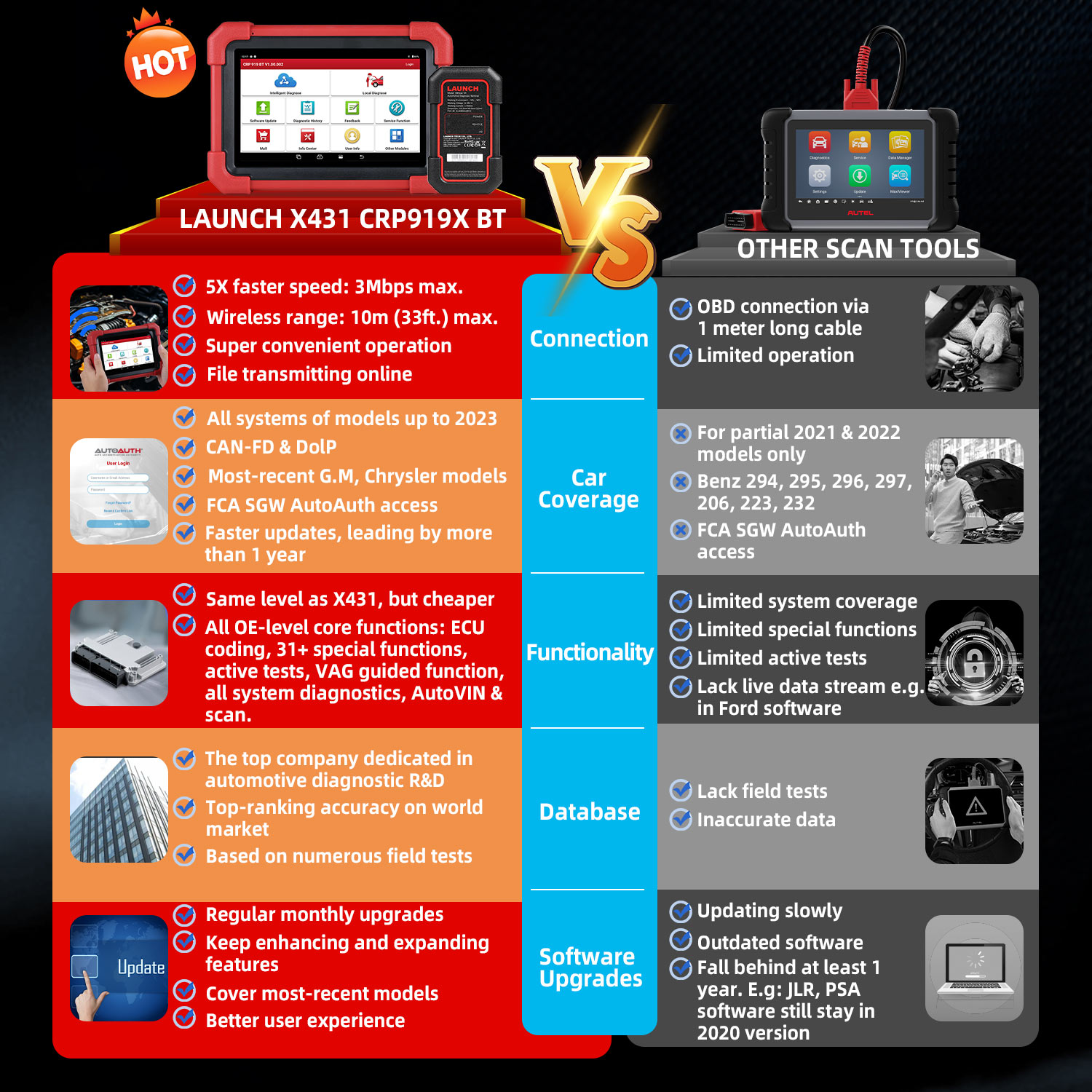 – LAUNCH X431 CRP919XBT, upgraded from CRP919X, includes a VCI for wireless data transmission (3Mbps max)