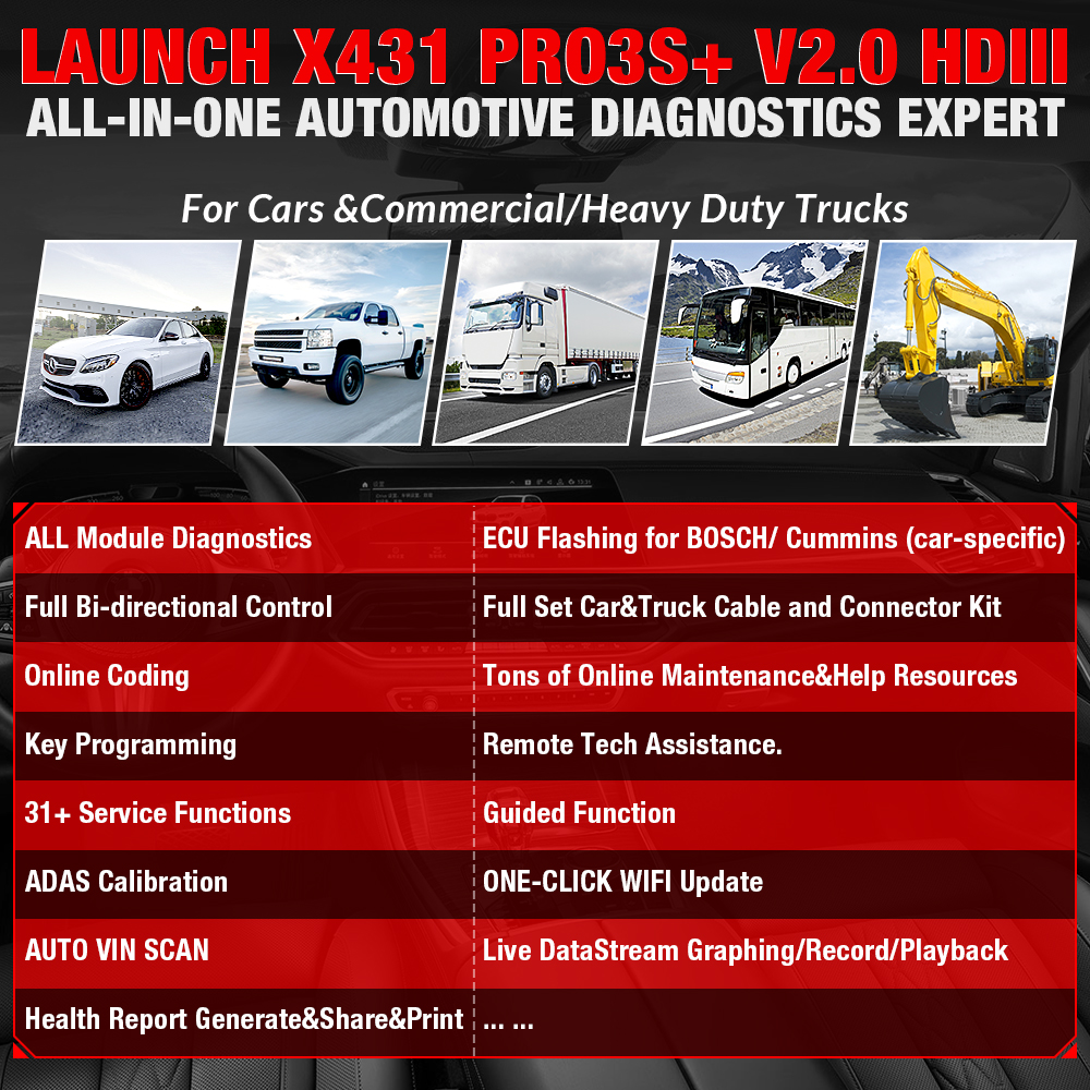 LAUNCH X431 PRO3S+ HDIII support read/clear DTCs, read live data stream and perform active test and services functions for ALL modules of Cars&Trucks including Engine system/SRS system/Retarder system/Transmission system/CAB Climate system/Unit Pump system/Electronical control system/Tail gas after-treatment system/Body system/ABS(anti-lock brake system)/Instrument System/Brake control system/Suspension system/Common Rail System/Natural gas system…etc.